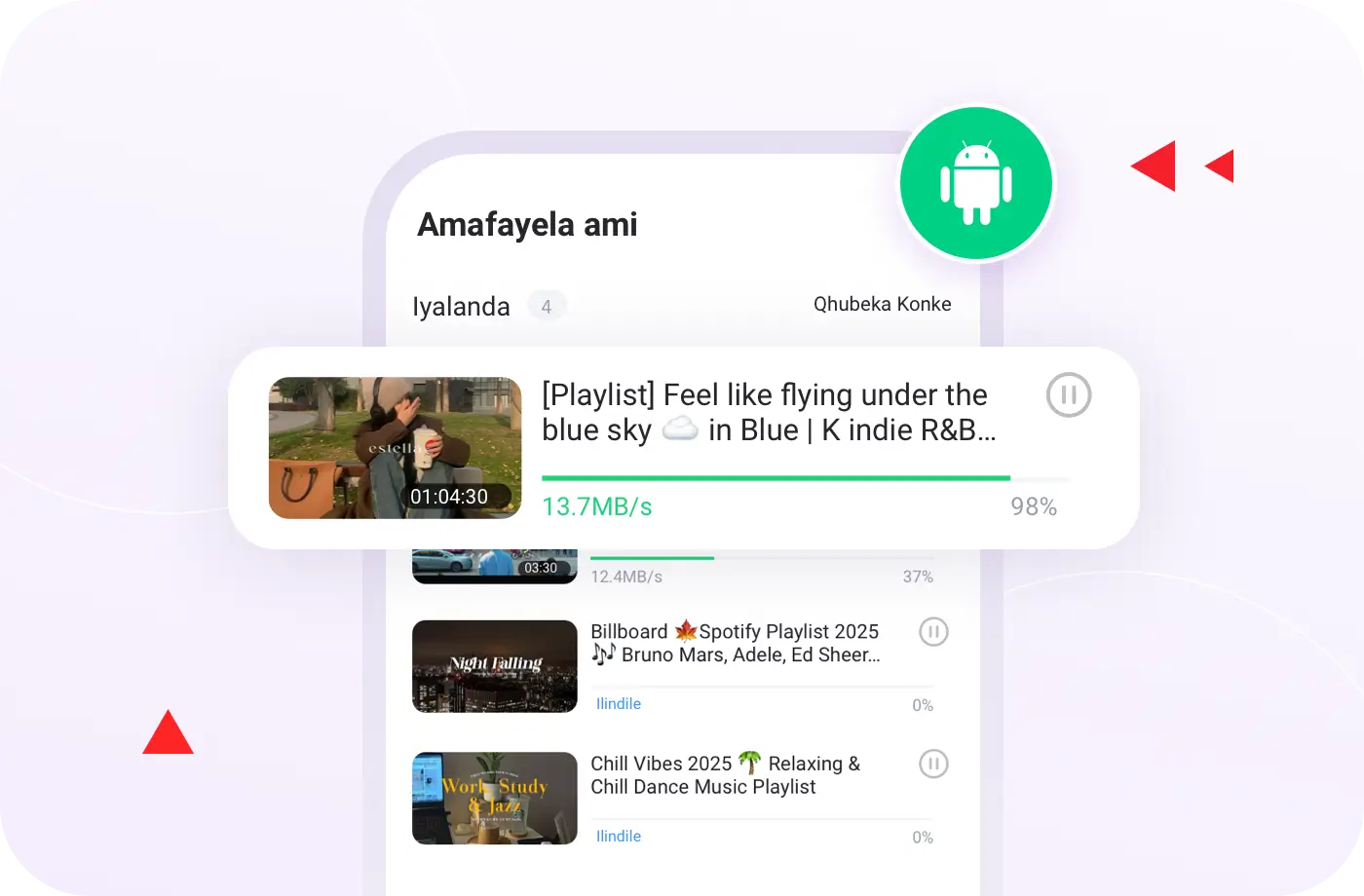 Gcina ama‑playlist wonke ngokuthepha okukodwa; i‑Muka ilanda zonke ividiyo ngokuzenzakalelayo.